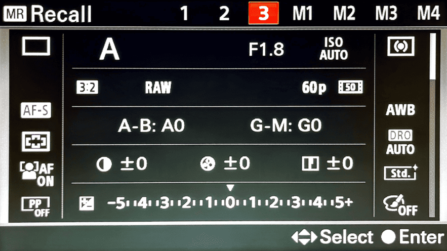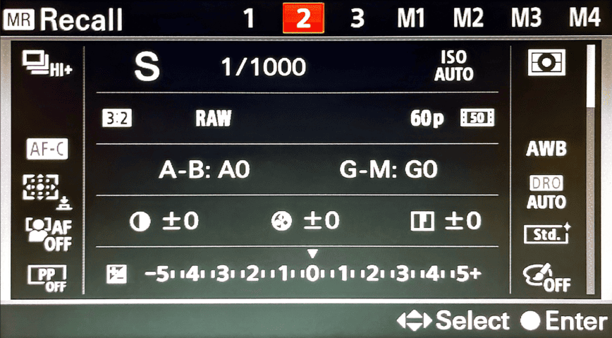 I find this is the most efficient way to do it, and it works much faster than just setting up a memory recall and then rotating the mode dial from A (Aperture Priority) to MR (Memory Recall) and then choosing one, which takes at least 5 seconds. But with a custom hold, you can do this within just a fraction of a second.