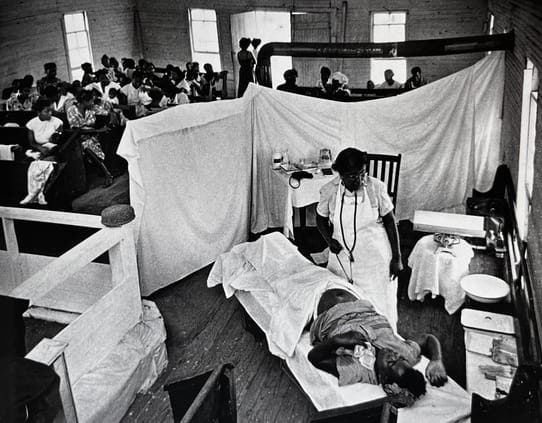 The Battle of Okinawa (1945) for Life magazine, a powerful series capturing the brutality of combat and the suffering of civilians during World War II. In Country Doctor (1948), also for Life, he followed Dr. Ernest Ceriani in rural Colorado, photographing the challenges of medical care in isolated communities. Nurse Midwife (1951) documents Maude Callen, a nurse midwife in South Carolina who provided care to poor, mostly Black communities. That same year, Spanish Village explored the everyday life in the rural Spanish village of Deleitosa under Franco’s regime. Finally, in A Man of Mercy (1954), Smith photographed a humanitarian doctor, Albert Schweitzer, at his hospital in Lambaréné, Gabon.